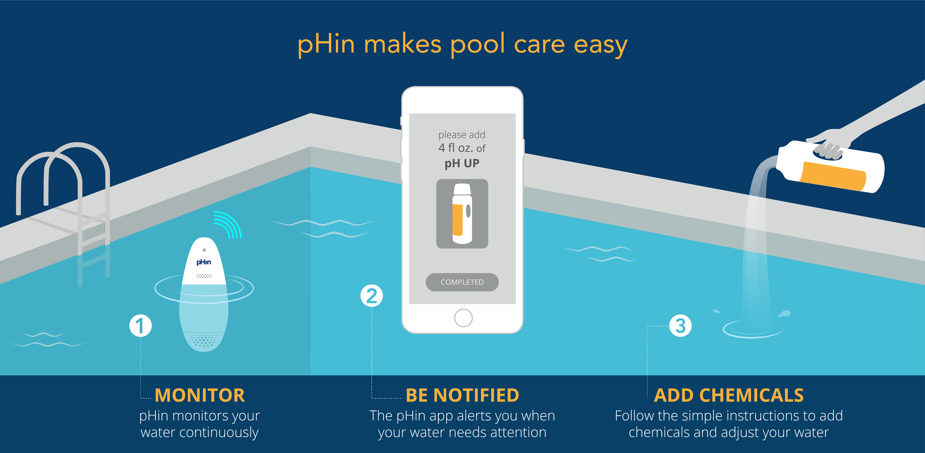 pHin is a smart water monitor with an app that measures your pool, hot tub or spa’s temperature, sanitizer and pH levels over 1000x each week, analyzes the data and creates recommendations based on the water’s quality.
