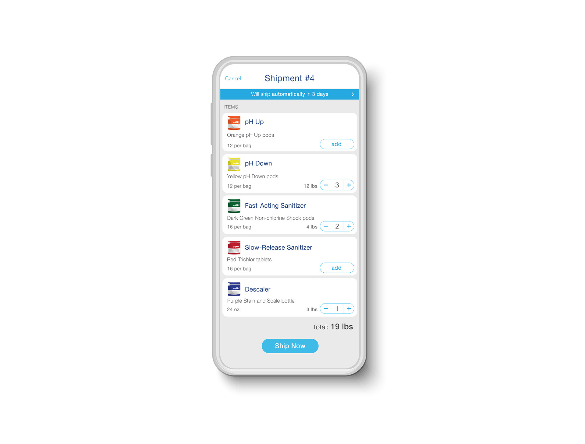 Customers can set their shipments on either Automatic or Manual. If set on manual, they need to create shipments manually and add any chemicals they are out or low. Also they will be able to track a shipment that is in transit or check their history of shipments.