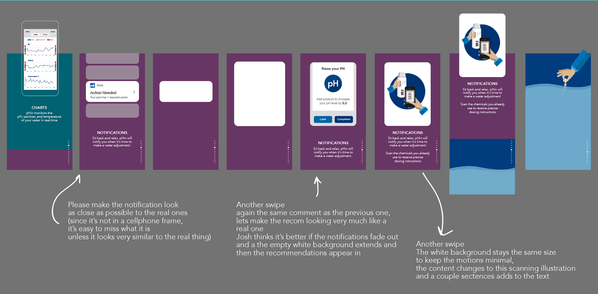 The following screenshots are the storyboard I created to show the vertical flow of the screens and pitch the story to the team. (The notes are first round of edits I requested from my developer teammate.)