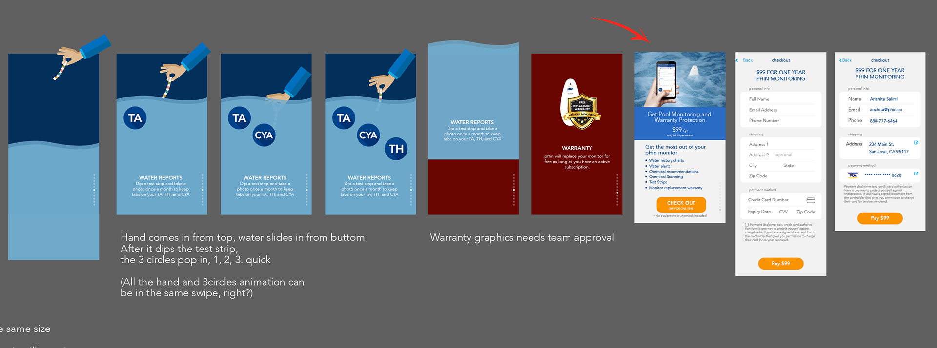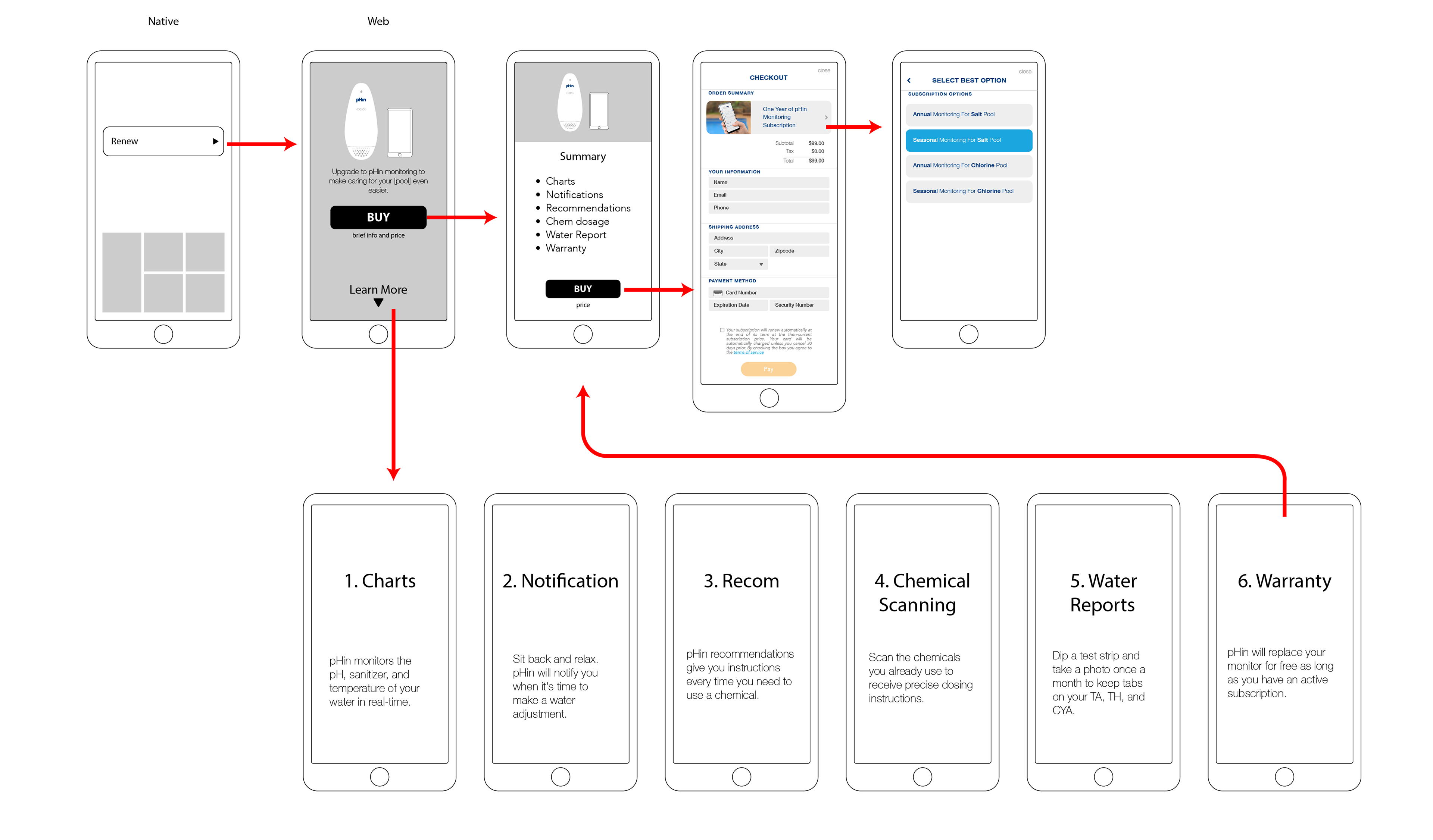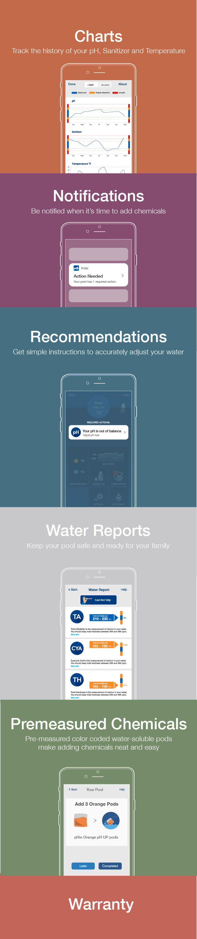 The final result is a playful mix of animated illustrations that slide vertically and each screen represent a feature in a simple and friendly trend. I tried to avoid wordy screens, and showcase each feature with familiar graphics that users have already got used to in the app. The strategy to review all the benefits of subscription in a carefully crafted order had a significant impact and lowered the churn rate for about 30%. The success of this project, made us believe we can use the same strategy for our "upgrade" option which is prompting users to buy their chemicals from pHin too.