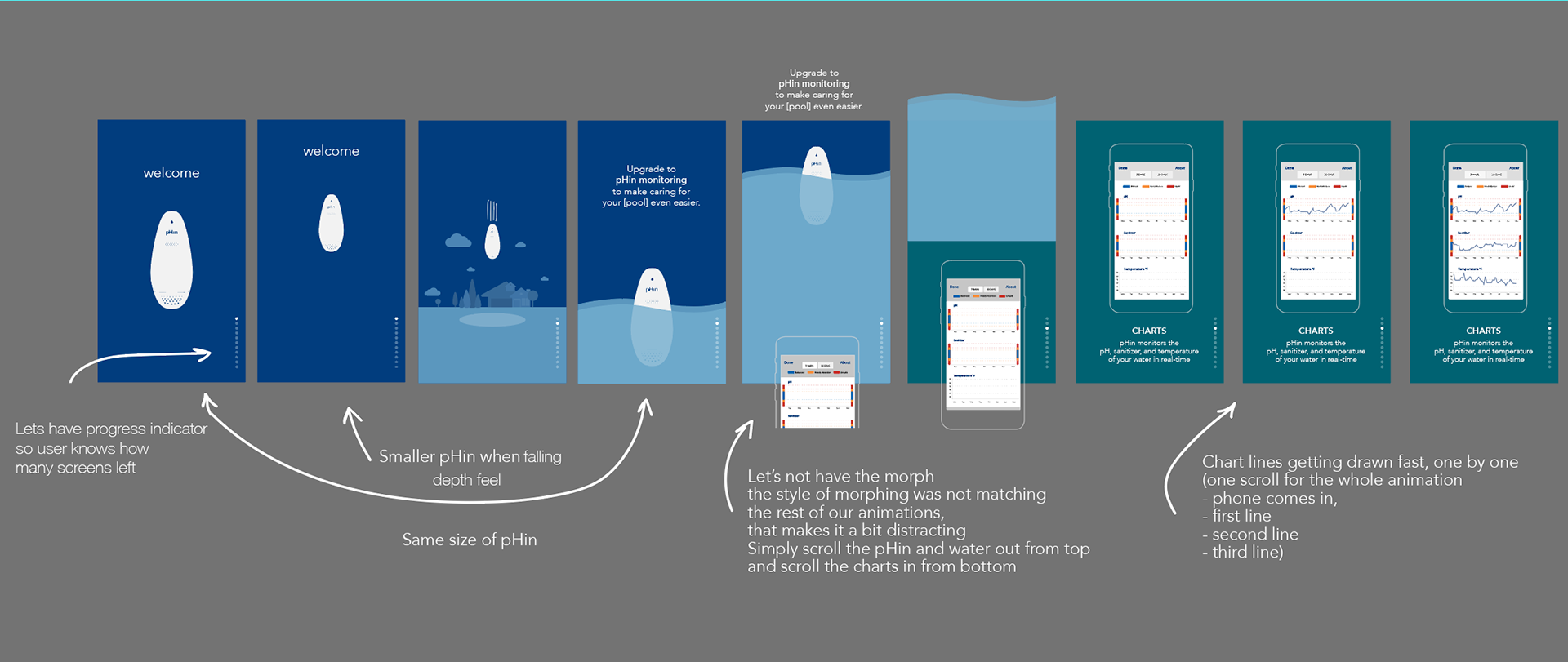 So I decided to use vertical scroll to reach my goal and reversed the colors back to the pHin palette (or very close to them.) Next I needed to make a storyboard and plan the animations.